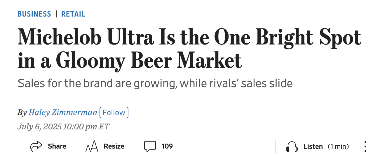 While the category continues to struggle, Michelob ULTRA is growing. And quickly. This positioning is proving to work and is on track to put ULTRA on top of the category.